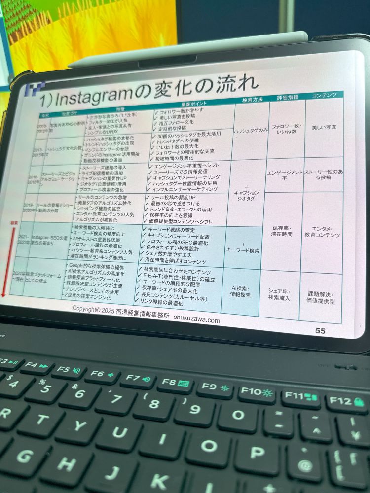 また、Instagram は変化が激しいので、これまでの「検索方法」「指標」「集客ポイント」の変化を伝える資料を作ってみました。