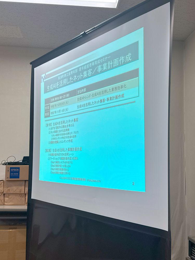 名古屋商工会議所でのIT相談が終わってからは、東浦町商工会に移動し、若手経営者向けセミナーの2回目を実施しました。