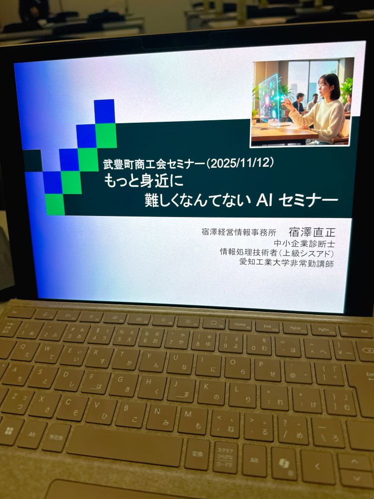 最後は武豊町商工会へ移動し、夜間の生成AIセミナーを担当しました。今年で3年連続でこの夜間セミナーをお任せいただいています。