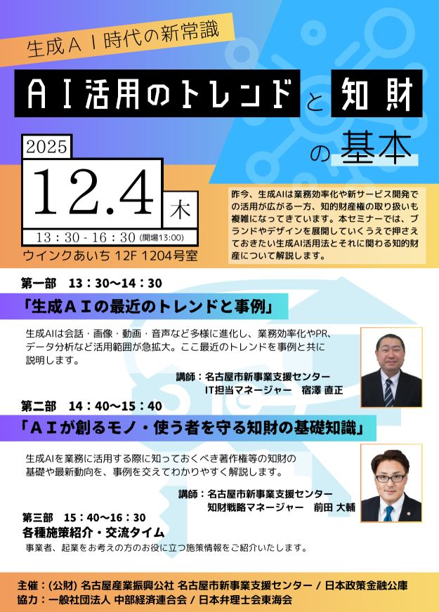 名古屋市新事業支援センターで自分としては今年最後の生成AIセミナーを行います。