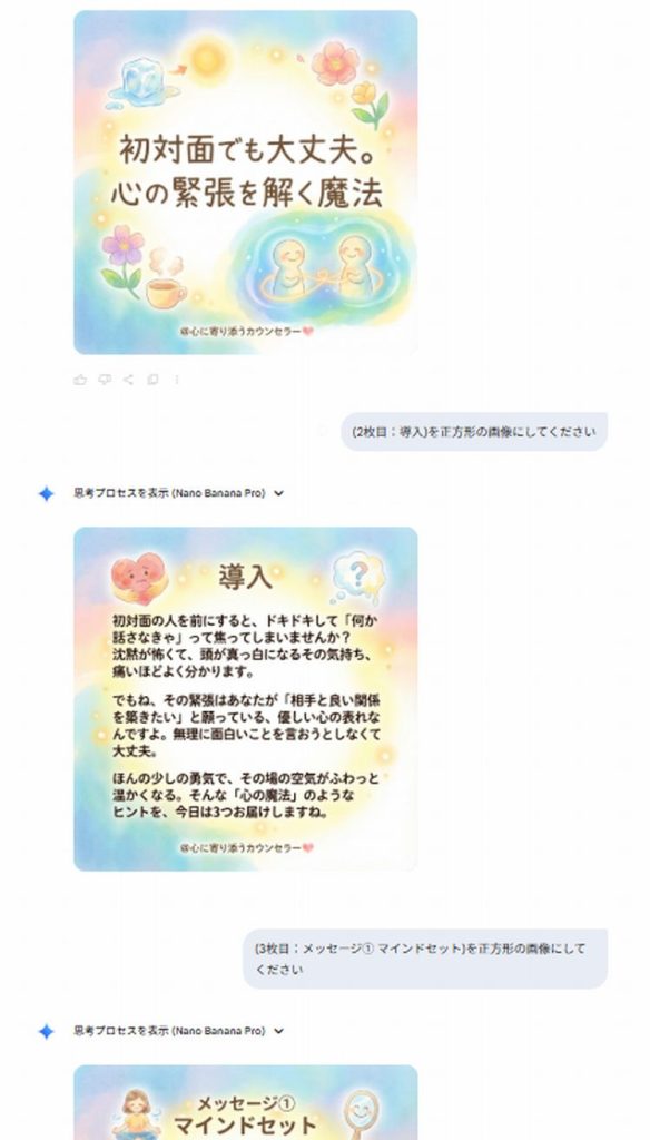 カルーセル投稿の案を作ってもらい、NanobananaProに各ページの画像を作成してもらうと、日本語の処理が非常に自然でよい感じでした。