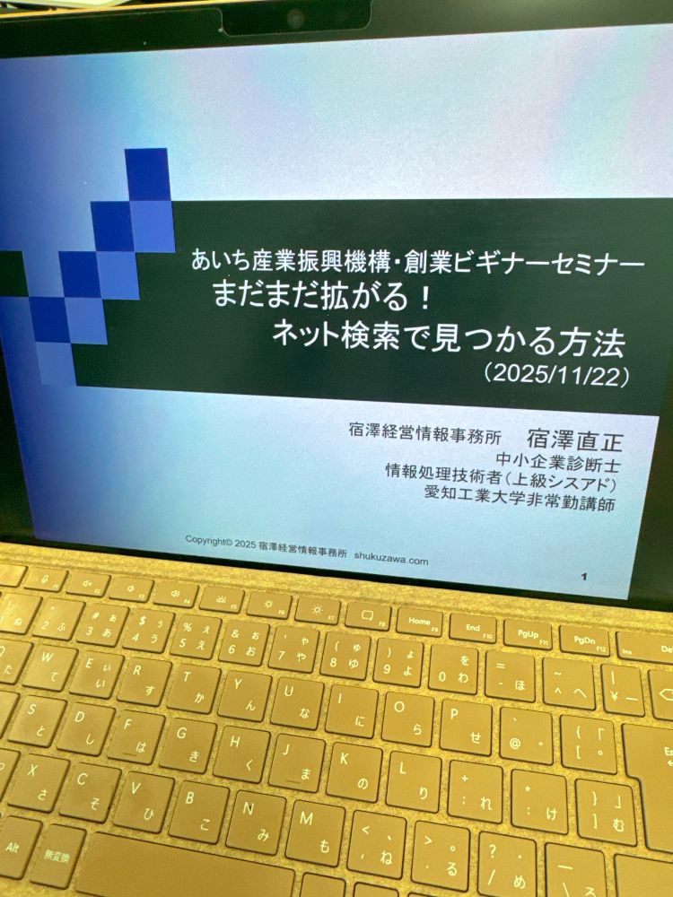 久々にあいち産業機構にお邪魔して創業ビギナーセミナーでした。テーマは「生成AI活用によるネット検索」です。