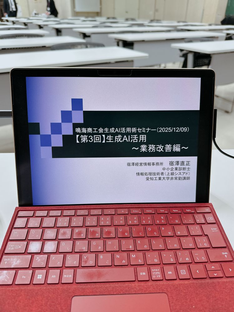 名古屋商工会でIT専門相談の後、夜は鳴海商工会の生成AI連続セミナーの3回目「業務改善」で、最終回が無事に終了しました。