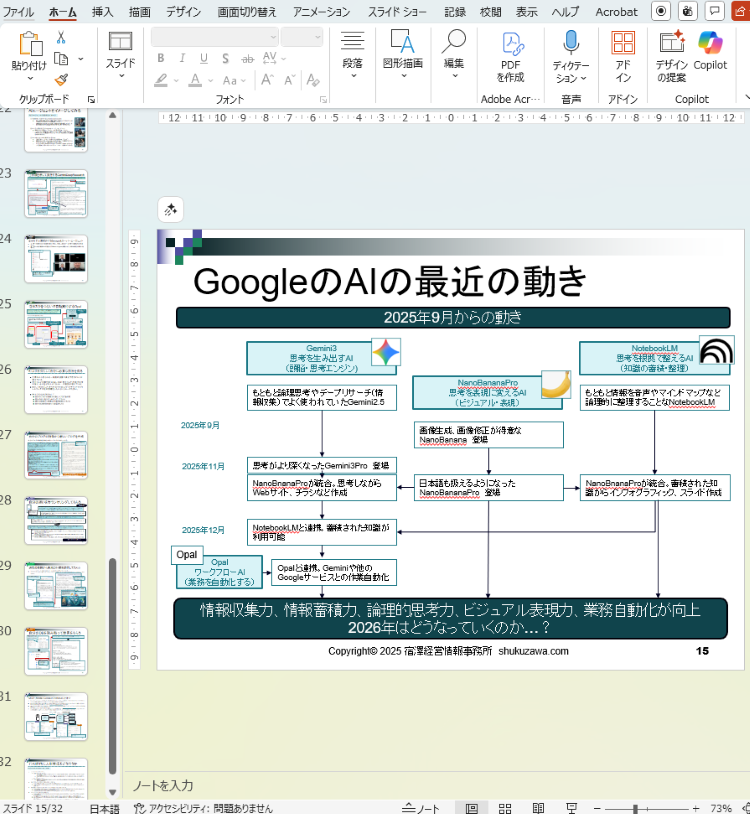 思考エンジンの「Gemini3」、ビジュアル表現の「NanoBananaPro」、知識整理の「NotebookLM」の各AIが個々が進化しています。