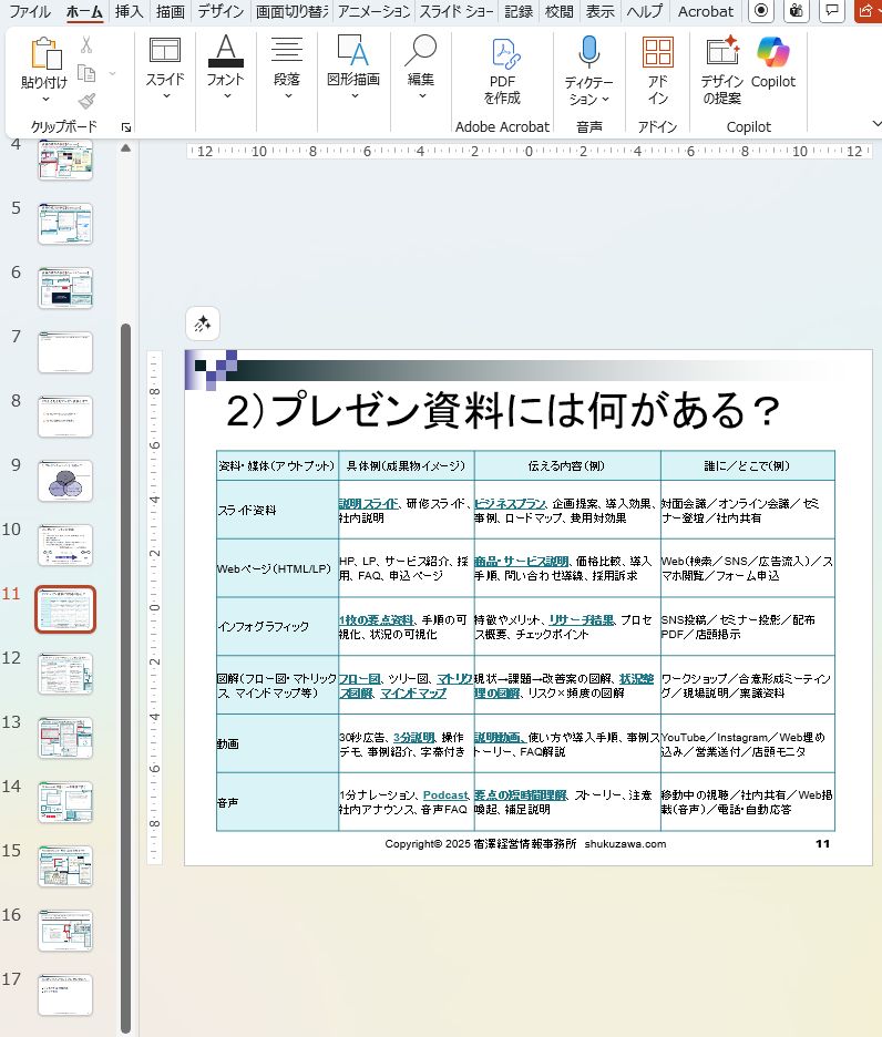 また、プレゼン資料作成も「人に伝える資料とは何か」をテーマに、その企画の部分を壁打ちするワークをしたいと考えました。