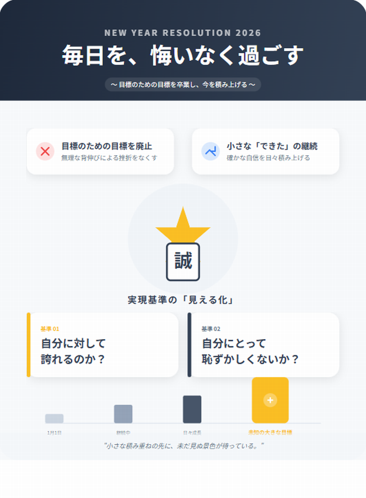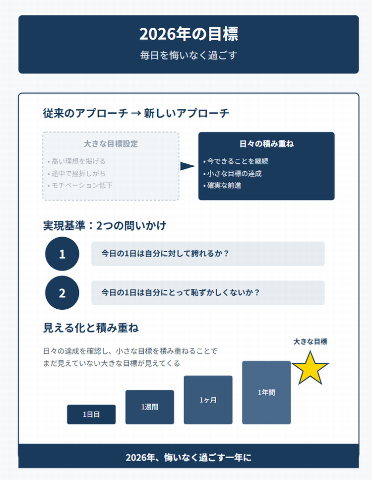 自分の場合は、多くの大きな目標を立ててそれに向かうというよりも、日々自分ができているかどうかという小さな目標を積み上げた方が向いているようです。