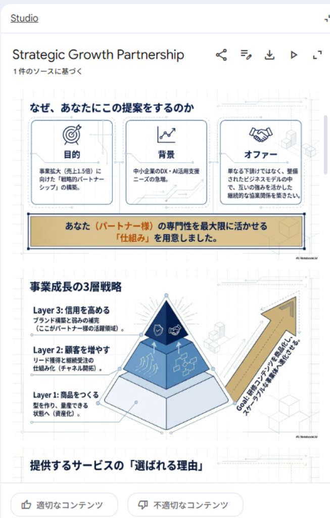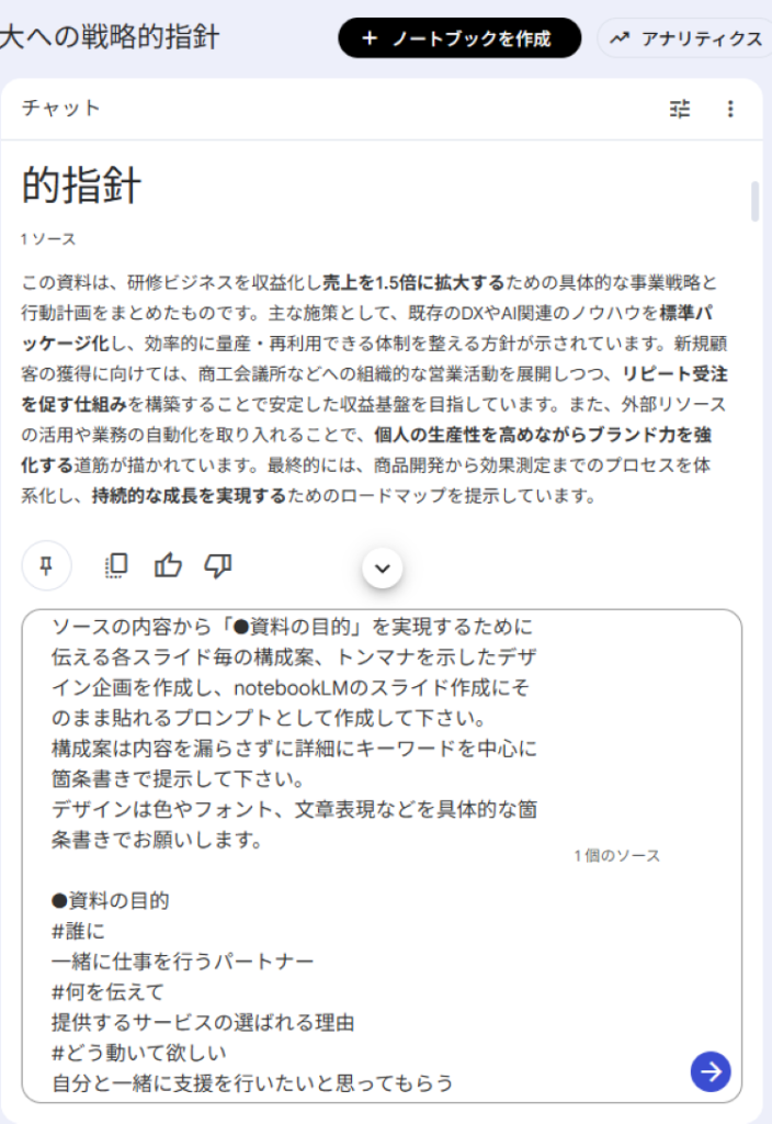 具体的には、NotebookLMでソースを取り込んだ後、その内容を踏まえながら各スライドの構成案とデザイン企画書のプロンプトを提案してもらいます。