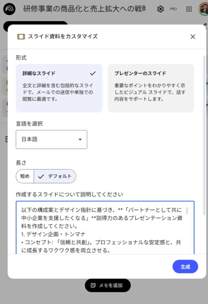そしてもう一つ、すごく基本的なことなのですが、NotebookLMでスライドを作成するときに大事なことを忘れていることが多いです。