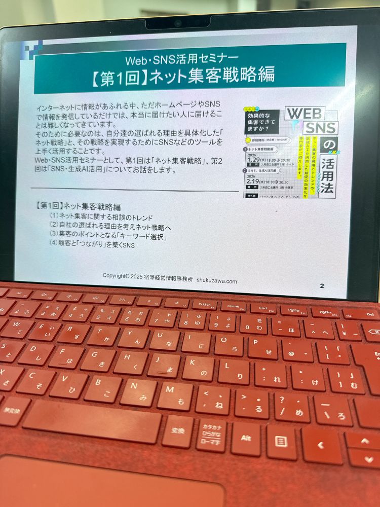 夜は大府商工会議所に移動してネット集客セミナーです。2回シリーズで今回が「ネット戦略」、次回が「SNS・生成AI活用」です。
