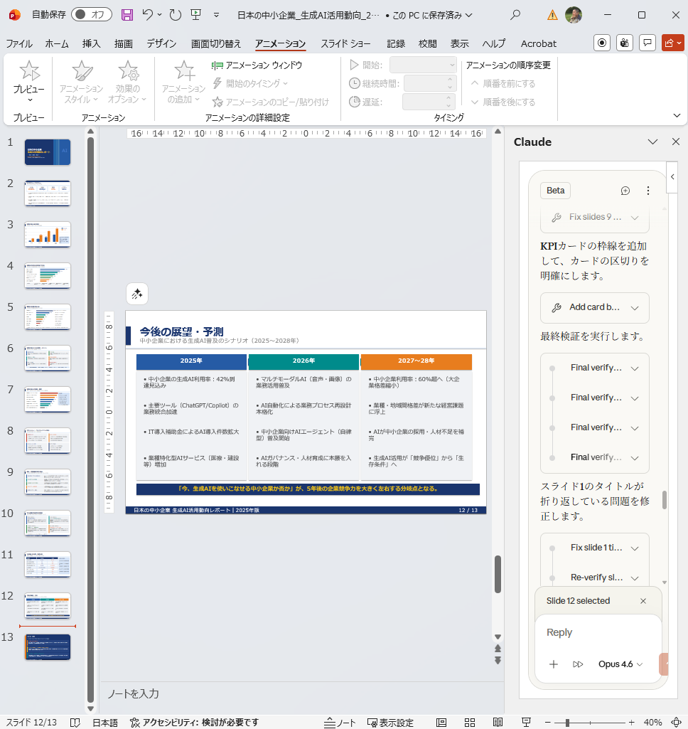 Claude Codeで作成したパワポ資料を、今度は「Claude in PowerPoint」機能で修正する、という組み合わせも効果的でした。
